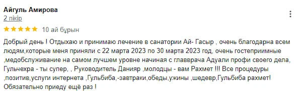 Добрый день ! Отдыхаю и принимаю лечение в санатории Ай- Гасыр, очень благодарна всем людям,которые меня приняли с 22 марта 2023 по 30 марта 2023 год, очень гостеприимные ,медобслуживание на самом лучшем уровне начиная с главврача Адуали профи своего дела, Гульчехра - ты супер, , Руководитель Данияр ,молодцы - вам Рахмет !!! Все процедуры ,позитив,услуги интернета ,Гульбиба,-завтраки,обеды,ужины ,шедевр,Гульбиба рахмет! Обязательно приеду ещё раз !