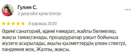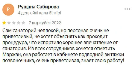Сам санаторий неплохой, но персонал очень не приветливый, не хотят объяснять как проходит процедура, что испортило хорошее впечатление от санатория. Из всех сотрудников хочется отметить Маржан, она работает в кабинете подводной вытяжки позвоночника, очень приветливая, знает свою работу!