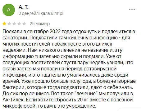 Поехали в сентябре 2022 года отдохнуть и подлечиться в санатории. Подхватили там кишечную инфекцию - для многих посетителей тюбаж после этого длился неделями. Нам никакого лечения не назначили, эту информацию тщательно скрыли и подмяли. Уже от следующих посетителей спустя пару недель узнали, что оказывается мы попали на период ротавирусной инфекции, и это тщательно умалчивалось даже среди врачей. Уже прошло больше полугода, а болезнетворные бактерии, которые тогда подхватили, дают о себе знать. До сих пор лечимся. Вот такое "лечение" мы получили в Ак-Тилек. Если хотите сбросить 20 кг вместе с полезной микрофлорой, то вам в это учреждение